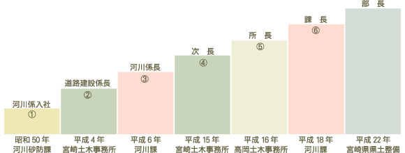 私は河川行政をやりたくて、大学では下津先生の指導のもと河川水文学を勉強し、県庁に入ってからは、経歴に記載のとおり7割は希望した河川に関する業務に携わらせて頂きました。