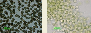 図-1 パルス放電前(左)と放電後(右)のアオコの様子 |