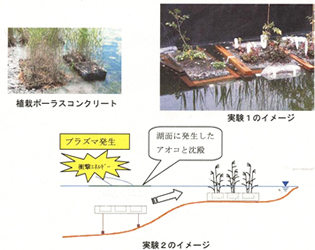 この場合の問題点は仮死状態になったアオコ処理であり,グローバルCOEプログラムでは立命館大学との共同研究(写真-1)により ポーラスコンクリートの適用した固定化に注目し研究を開始しました。 図-2のように実験1では,立命館大学・理工学部・研究施設内のプールにポーラスコンクリート(以下POC)を沈め, 琵琶湖もしくはその内湖から採取してきたアオコをプールに浮かべ衝撃エネルギー発生装置によって沈下させることによって,POC 内部に取り込ませることに成功し,リン等富栄養化物質の閉鎖実験系内収支の算定や水質保全の効果を把握しています。