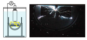 図-3に示すように、水中に設置した電極間のコンクリートに高電圧を印加します。すると、水、コンクリートを形成する無機固体、