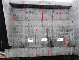 ただし、実験を行った時点でこれらのひび割れは表面補修が行われ表面部にひび割れは認められませんでした。 ただし、表面部の補修のみを行ったため、内部のひび割れは初期状態のまま残されていると考えられました。 調査によれば、これらのひび割れ深さは超音波法(iTECS)によって、No. 9部 70mm、No. 10部 50mm、No. 11部 60mm となっていました。